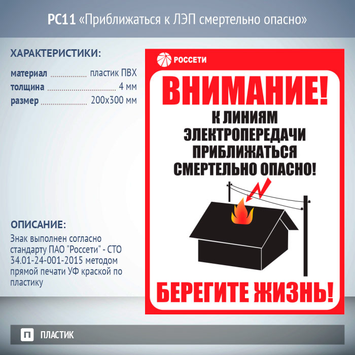 Знак «Приближаться к ЛЭП смертельно опасно», РС11 (пластик 2 мм, 200х300 мм)