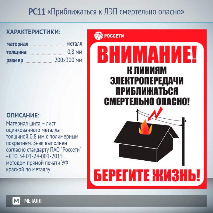 Знак безопасности «Приближаться к ЛЭП смертельно опасно» выполнен согласно стандарта ПАО «Россети» – СТО 34.01-24-001-2015 методом прямой печати УФ краской по металлу. Материал знака – лист оцинкованного металла толщиной 0,8 мм с полимерным покрытием. Размеры знака – 200×300 мм
