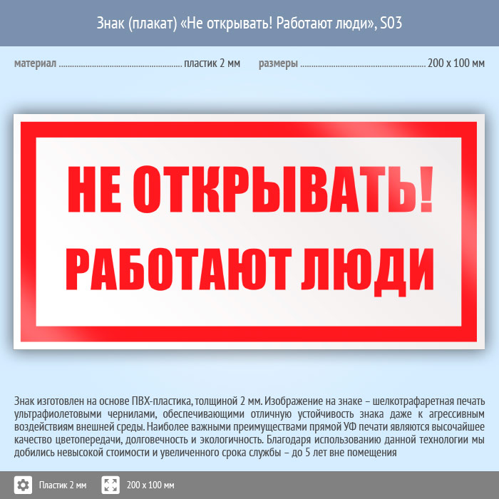 Знак (плакат) «Не открывать! Работают люди», S03 на пластике, размером 200х100 мм предупреждает о том, что открывать опасно для жизни людей. Знаки и плакаты по электробезопасности изготовлены согласно требованиям Министерства энергетики России и являются предупреждающими знаками об опасности, связанной с электронапряжением
