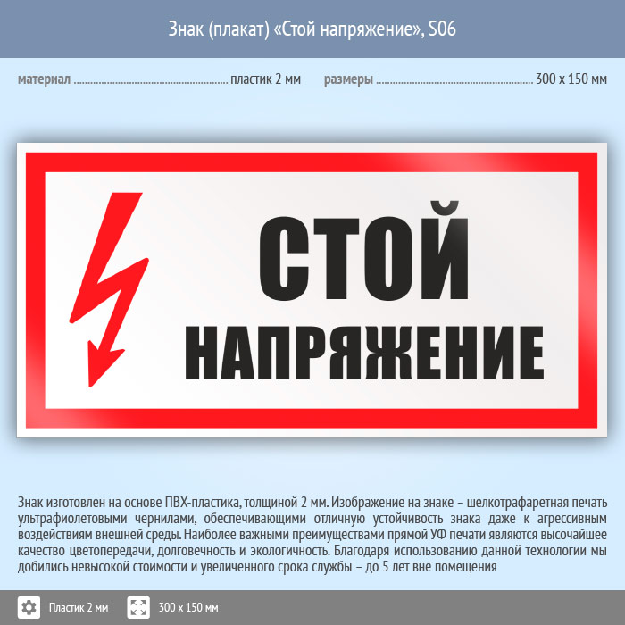 Знак (плакат) «Стой напряжение», S06 на пластике, размером 300х150 мм предупреждает об электрическом напряжении. Знаки и плакаты по электробезопасности изготовлены согласно требованиям Министерства энергетики России и являются предупреждающими знаками об опасности, связанной с электронапряжением