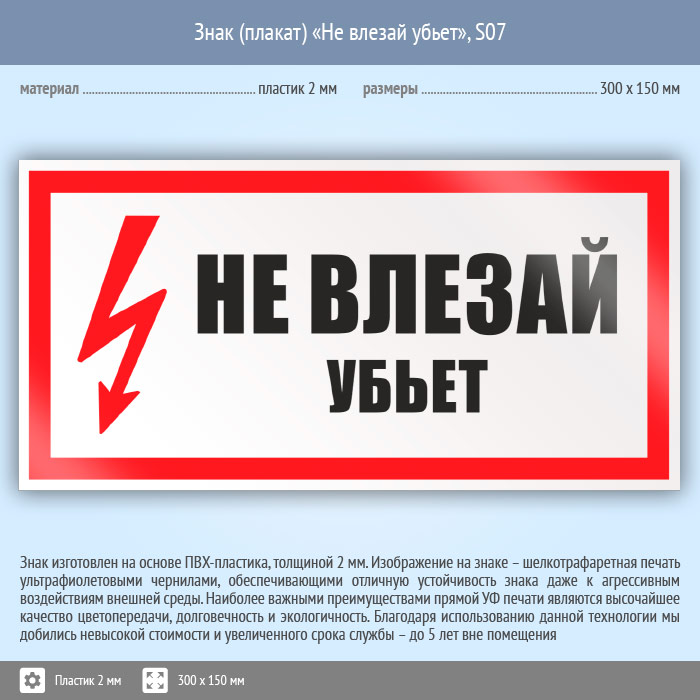 Знак (плакат) «Не влезай убьет», S07 на пластике, размером 300х150 мм предупреждает об опасности и угрозе жизни в случае проникновения в опасное место, находящееся под напряжением. Знаки и плакаты по электробезопасности изготовлены согласно требованиям Министерства энергетики России и являются предупреждающими знаками об опасности, связанной с электронапряжением