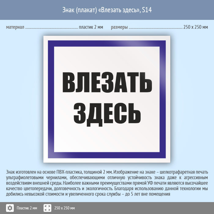 Знак (плакат) «Влезать здесь», S14 на пластике, размером 250х250 мм обозначает безопасный путь подъема к рабочему месту, находящемуся на высоте. Знаки и плакаты по электробезопасности изготовлены согласно требованиям Министерства энергетики России и являются предупреждающими знаками об опасности, связанной с электронапряжением
