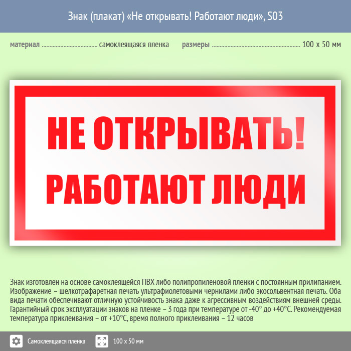 Знак (плакат) «Не открывать! Работают люди», S03 на пленке, размером 100х50 мм предупреждает о том, что открывать опасно для жизни людей. Знаки и плакаты по электробезопасности изготовлены согласно требованиям Министерства энергетики России и являются предупреждающими знаками об опасности, связанной с электронапряжением