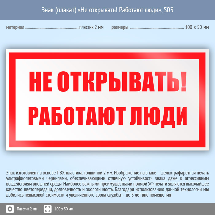 Знак (плакат) «Не открывать! Работают люди», S03 на пластике, размером 100х50 мм предупреждает о том, что открывать опасно для жизни людей. Знаки и плакаты по электробезопасности изготовлены согласно требованиям Министерства энергетики России и являются предупреждающими знаками об опасности, связанной с электронапряжением