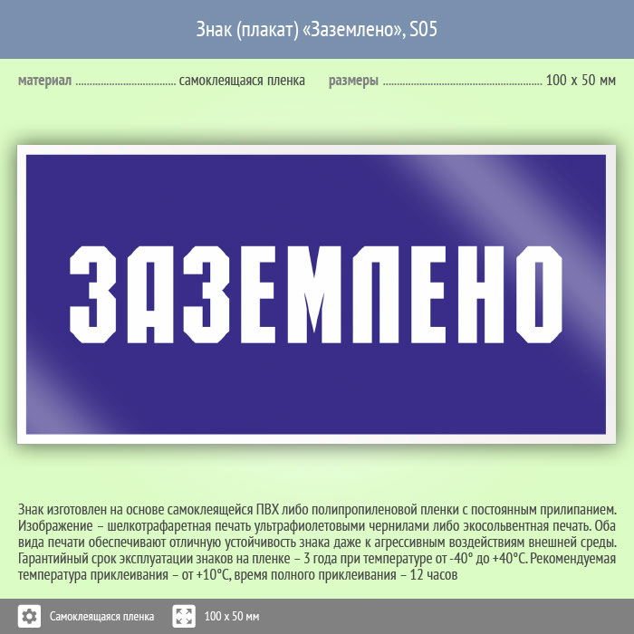 Знак (плакат) «Заземлено», S05 на пленке, размером 100х50 мм размещается на оборудовании и электрощитах для обозначения заземления. Знаки и плакаты по электробезопасности изготовлены согласно требованиям Министерства энергетики России и являются предупреждающими знаками об опасности, связанной с электронапряжением