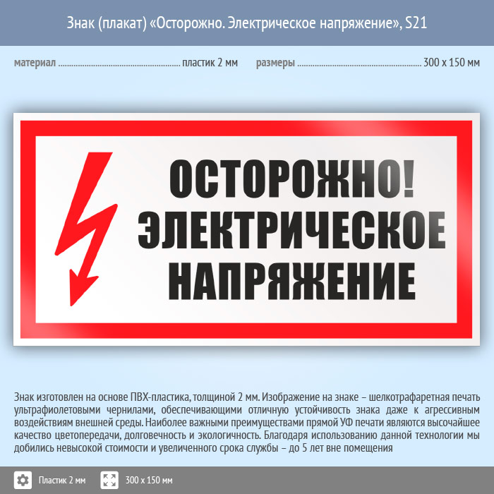 Знак (плакат) «Осторожно. Электрическое напряжение», S21 на пластике, размером 300х150 мм обозначает опасное место, связанное с электричеством. Знаки и плакаты по электробезопасности изготовлены согласно требованиям Министерства энергетики России и являются предупреждающими знаками об опасности, связанной с электронапряжением