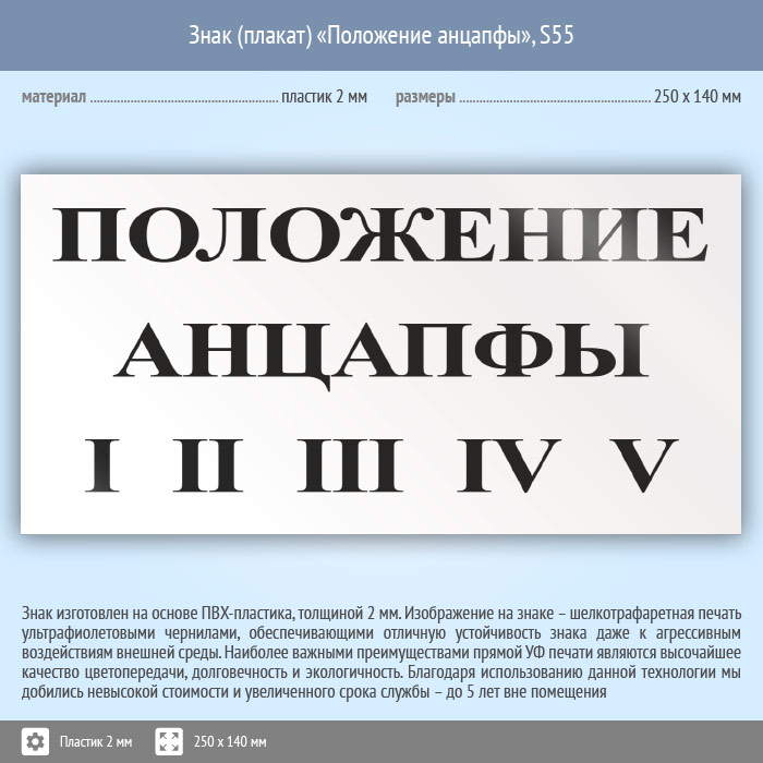 Знак (плакат) «Положение анцапфы», S55 на пластике, размером 250х140 мм применяется на силовых трансформаторах для указания положения регулятора числа витков. Знаки и плакаты по электробезопасности изготовлены согласно требованиям Министерства энергетики России и являются предупреждающими знаками об опасности, связанной с электронапряжением