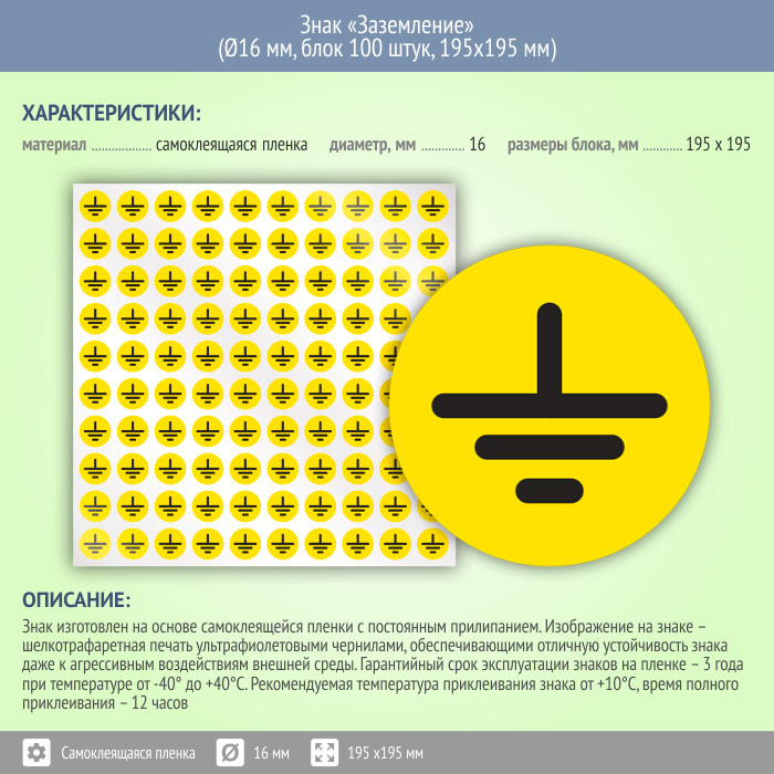 Знак (плакат) «Заземление», S46 диаметром 16 мм (блок из 100 штук) применяется для обозначения мест заземления в электротехнических изделиях и приборах. Знак печатается на желтой самоклеящейся пленке, после чего вырезается по контуру. Вид и размеры знака заземления полностью соответствуют требованиям ГОСТ 21130-75