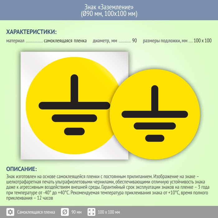 Знак (плакат) «Заземление», S46 диаметром 90 мм применяется для обозначения мест заземления в электротехнических изделиях и приборах. Знак печатается на желтой самоклеящейся пленке, после чего вырезается по контуру. Вид и размеры знака заземления полностью соответствуют требованиям ГОСТ 21130-75