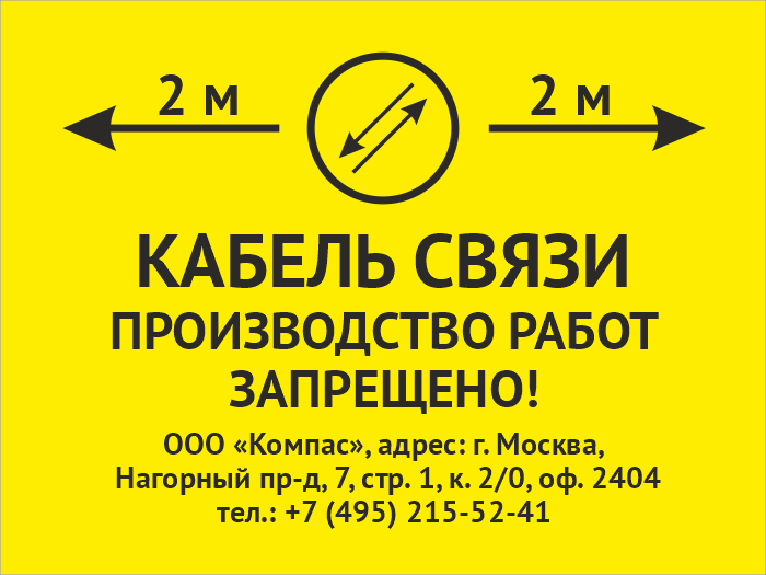 Знак «Охранная зона кабеля связи. Производство работ запрещено», OZK-03 на металле, размером 400х300 мм устанавливается для обозначения зоны залегания кабеля в местах его пересечения с автомобильной дорогой и другими коммуникациями. Знак должен быть установлен на определенном расстоянии от земли – на высоте человеческого роста (1,7 м). На нем обязательно размещение таких данных, как адрес и телефон эксплуатирующего линию предприятия, размеры охранной зоны
