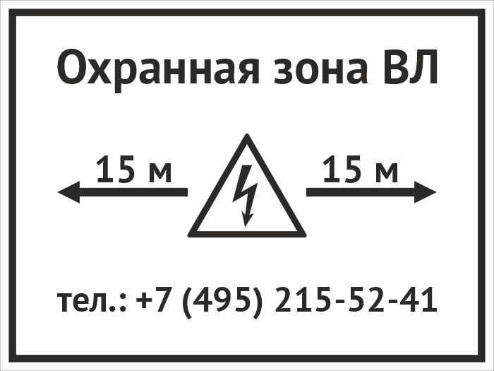 Табличка «Охранная зона ВЛ», OZK-10 на металле, размером 400х300 мм устанавливается для обозначения зоны залегания кабеля в местах его пересечения с автомобильной дорогой и другими коммуникациями. Знак должен быть установлен на определенном расстоянии от земли – на высоте человеческого роста (1,7 м). На нем обязательно размещение таких данных, как адрес и телефон эксплуатирующего линию предприятия, размеры охранной зоны