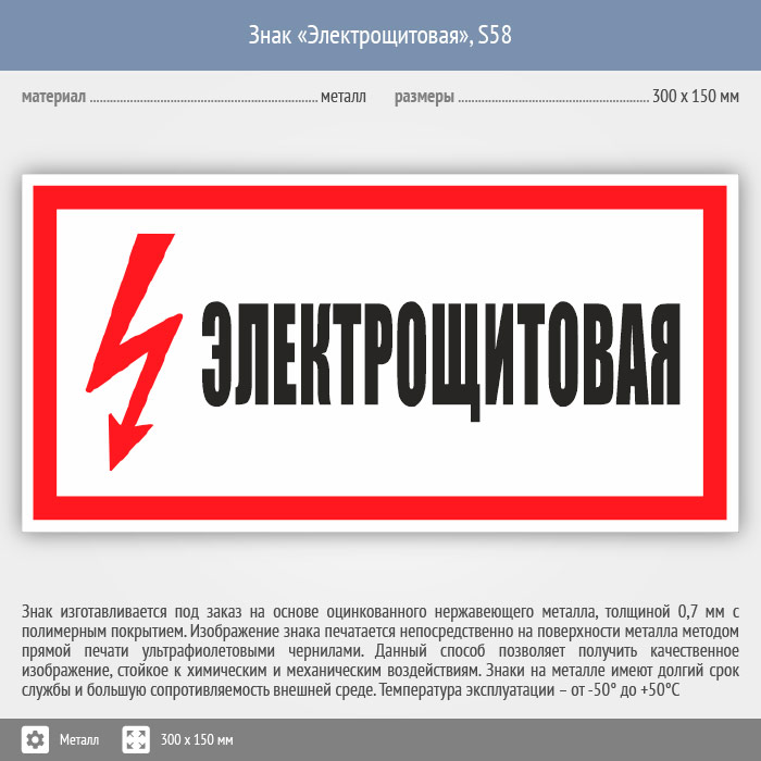 Знак (плакат) «Электрощитовая», S58 на металле, размером 300х150 мм размещается на дверях и створках электрических щитовых. Знаки и плакаты по электробезопасности изготовлены согласно требованиям Министерства энергетики России и являются предупреждающими знаками об опасности, связанной с электронапряжением