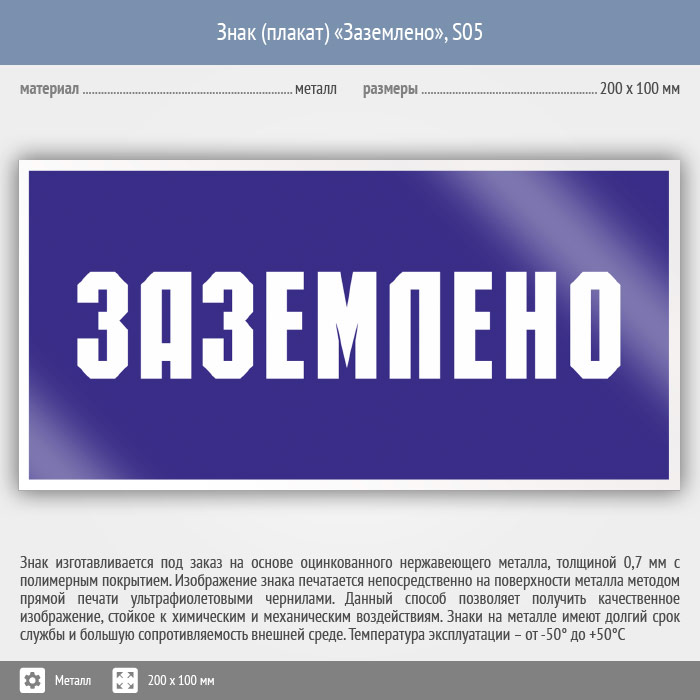 Знак (плакат) «Заземлено», S05 на металле, размером 200х100 мм размещается на оборудовании и электрощитах для обозначения заземления. Знаки и плакаты по электробезопасности изготовлены согласно требованиям Министерства энергетики России и являются предупреждающими знаками об опасности, связанной с электронапряжением