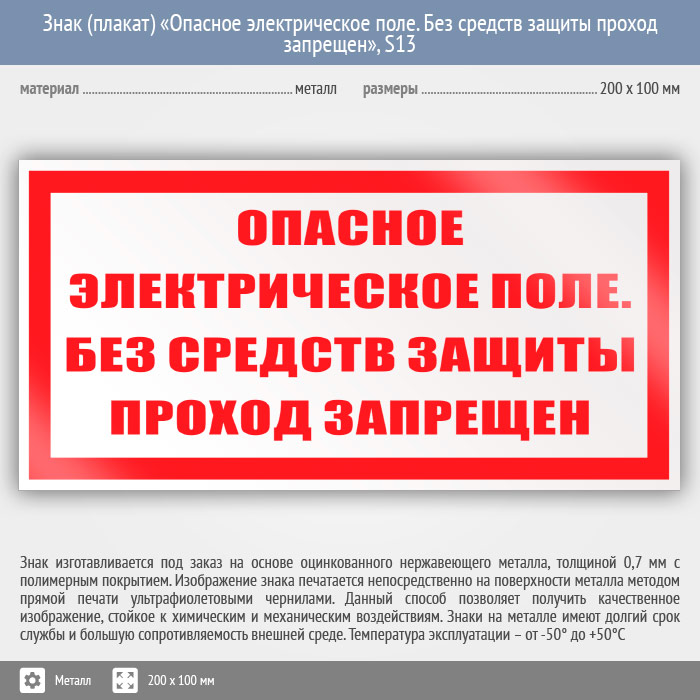 Знак (плакат) «Опасное электрическое поле. Без средств защиты проход запрещен», S13 (металл, 200х100 мм)