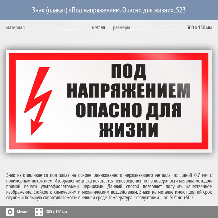 Знак (плакат) «Под напряжением. Опасно для жизни», S23 на металле, размером 300х150 мм предупреждает о том, что устройство находится под напряжением и представляет угрозу для жизни. Знаки и плакаты по электробезопасности изготовлены согласно требованиям Министерства энергетики России и являются предупреждающими знаками об опасности, связанной с электронапряжением