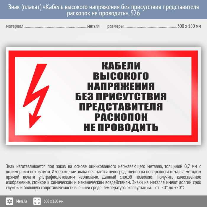 Знак (плакат) «Кабель высокого напряжения без присутствия представителя раскопок не проводить», S26 на металле, размером 300х150 мм размещают в местах прохождения высоковольтного кабеля. Знаки и плакаты по электробезопасности изготовлены согласно требованиям Министерства энергетики России и являются предупреждающими знаками об опасности, связанной с электронапряжением
