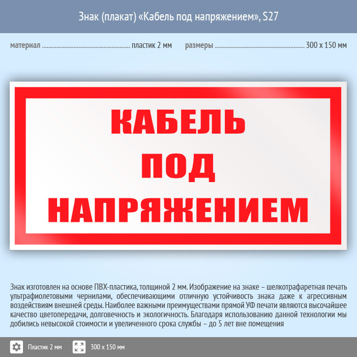 Знак (плакат) «Кабель под напряжением», S27 на пластике, размером 300х150 мм обозначает место, где проходит высоковольтный кабель. Знаки и плакаты по электробезопасности изготовлены согласно требованиям Министерства энергетики России и являются предупреждающими знаками об опасности, связанной с электронапряжением