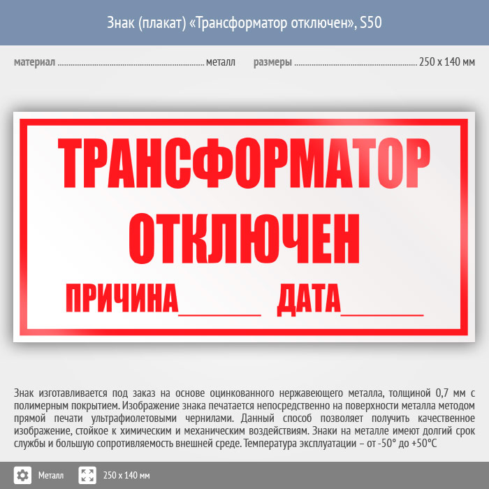 Знак (плакат) «Трансформатор отключен», S50 на металле, размером 250х140 мм вывешивается с целью сообщения, что трансформатор в данный момент отключен от питания. Знаки и плакаты по электробезопасности изготовлены согласно требованиям Министерства энергетики России и являются предупреждающими знаками об опасности, связанной с электронапряжением
