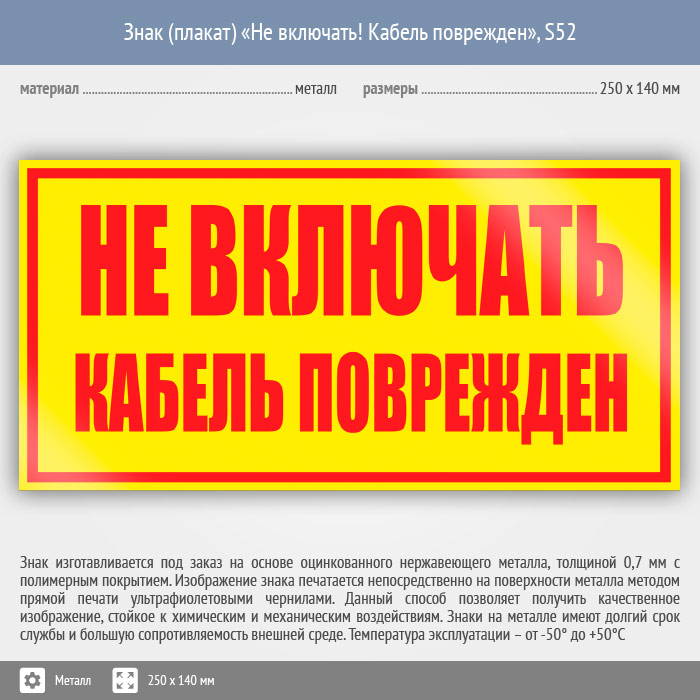 Знак (плакат) «Не включать! Кабель поврежден», S52 на металле, размером 250х140 мм предупреждает о том, что включать установку или электроприбор не безопасно, так как имеются повреждения. Знаки и плакаты по электробезопасности изготовлены согласно требованиям Министерства энергетики России и являются предупреждающими знаками об опасности, связанной с электронапряжением