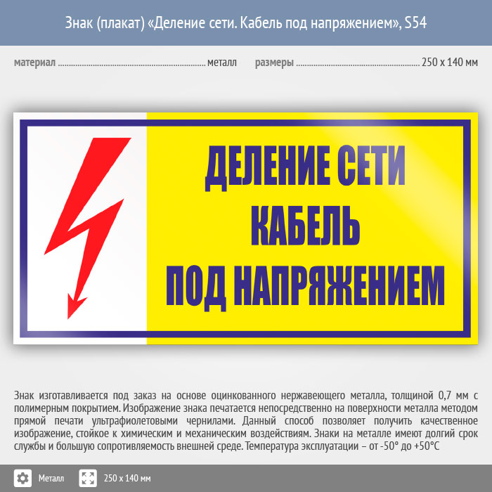 Знак (плакат) «Деление сети. Кабель под напряжением», S54 на металле, размером 250х140 мм предупреждает о том, что установка находится под напряжением. Знаки и плакаты по электробезопасности изготовлены согласно требованиям Министерства энергетики России и являются предупреждающими знаками об опасности, связанной с электронапряжением