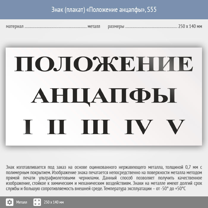 Знак (плакат) «Положение анцапфы», S55 на металле, размером 250х140 мм применяется на силовых трансформаторах для указания положения регулятора числа витков. Знаки и плакаты по электробезопасности изготовлены согласно требованиям Министерства энергетики России и являются предупреждающими знаками об опасности, связанной с электронапряжением