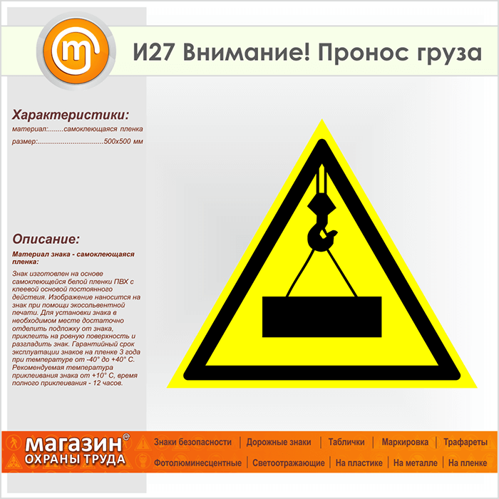 Знак «Внимание! Пронос груза», И27 (пленка, сторона 500 мм)
