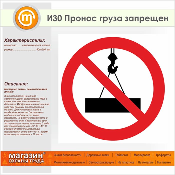 Знак «Пронос груза запрещен», И30 на пленке, размером 500х500 мм предполагает, что в данном месте пронос груза запрещается. Указательные таблички и предупреждающие знаки на строительной площадке помогут ориентироваться на месте строительства