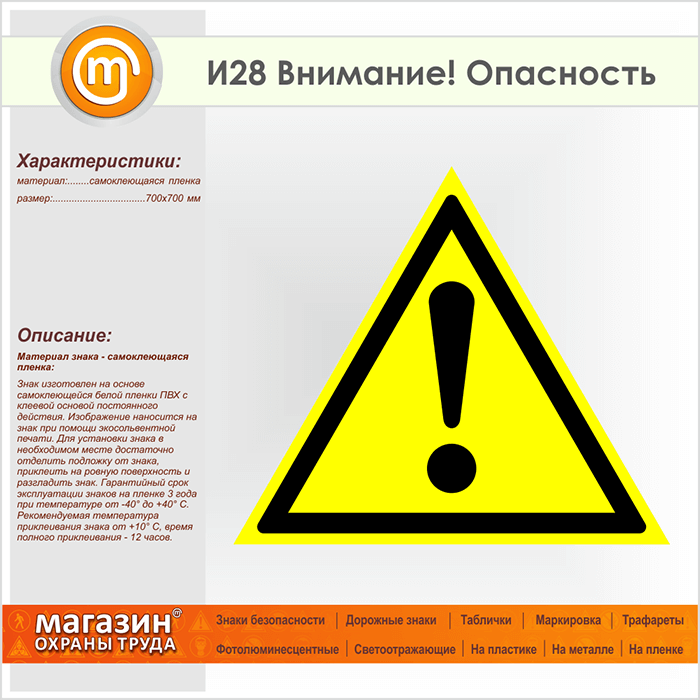 Знак «Внимание! Опасность», И28 на пленке, размером сторона 700 мм призывает к осторожности, в связи с повышенной опасностью в данном месте. Указательные таблички и предупреждающие знаки на строительной площадке помогут ориентироваться на месте строительства