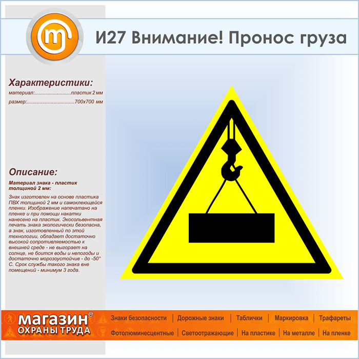Знак «Внимание! Пронос груза», И27 на пластике, размером сторона 700 мм предупреждает об опасности в близи работы подъемника или крана и возможном проносе груза. Указательные таблички и предупреждающие знаки на строительной площадке помогут ориентироваться на месте строительства