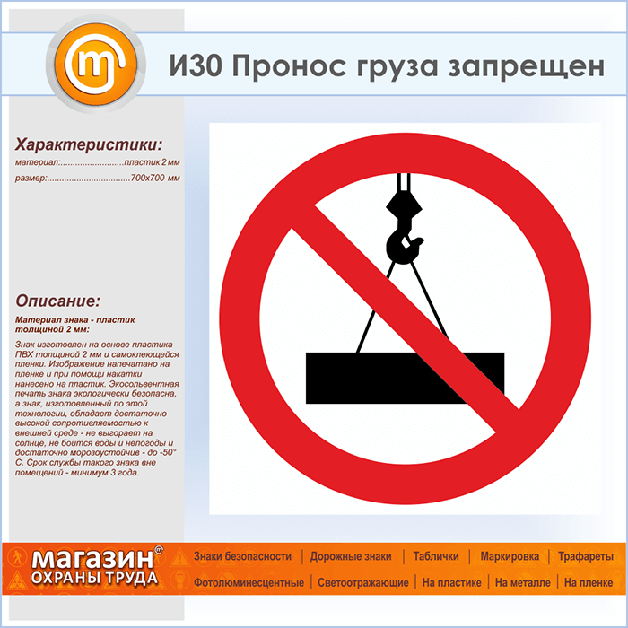Знак «Пронос груза запрещен», И30 на пластике, размером 700х700 мм предполагает, что в данном месте пронос груза запрещается. Указательные таблички и предупреждающие знаки на строительной площадке помогут ориентироваться на месте строительства