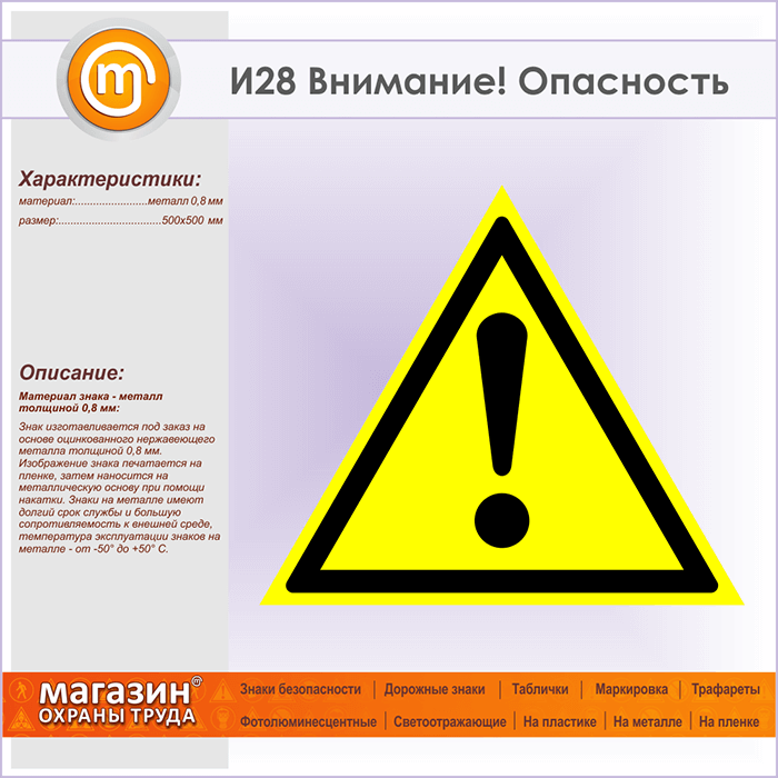 Знак «Внимание! Опасность», И28 на металле, размером сторона 500 мм призывает к осторожности, в связи с повышенной опасностью в данном месте. Указательные таблички и предупреждающие знаки на строительной площадке помогут ориентироваться на месте строительства