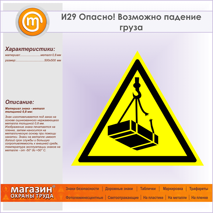Знак «Опасно! Возможно падение груза», И29 (металл, сторона 500 мм)
