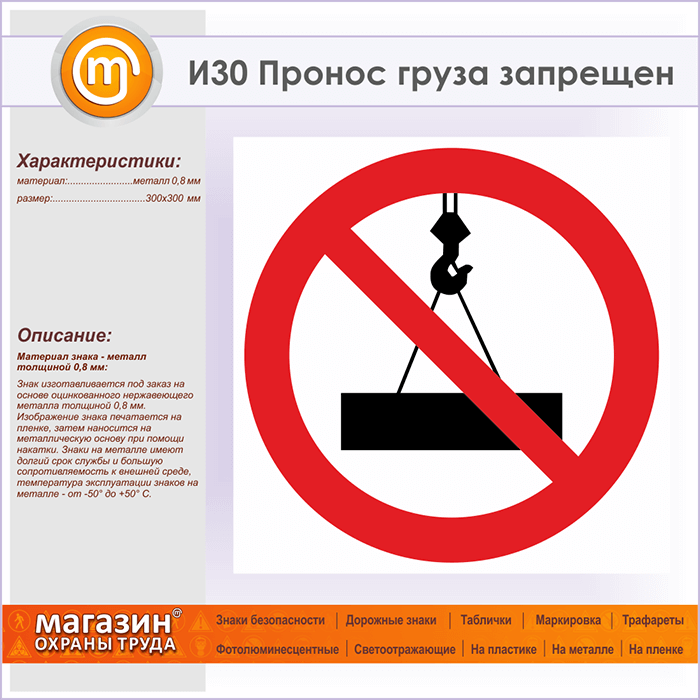 Знак «Пронос груза запрещен», И30 на металле, размером 300х300 мм предполагает, что в данном месте пронос груза запрещается. Указательные таблички и предупреждающие знаки на строительной площадке помогут ориентироваться на месте строительства