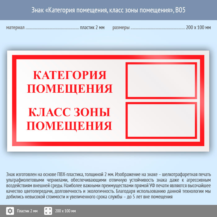 Знак «Категория помещения, класс зоны помещения», B05 (пластик, 200х100 мм)