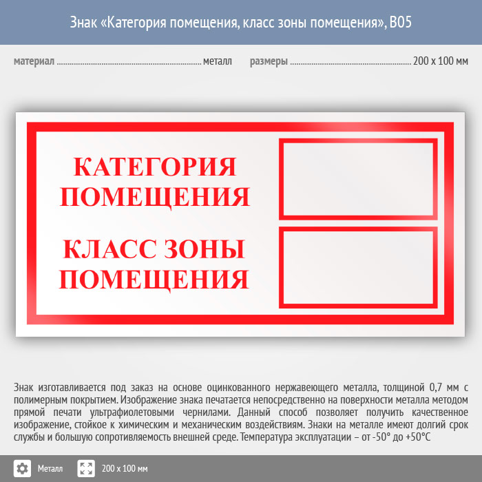 Знак «Категория помещения, класс зоны помещения», B05 на металле, размером 200х100 мм предназначен для информирования о категории взрыво- и пожароопасности помещения и классе зоны помещения. Знаки категорийности помещений необходимы для быстрого определения класса опасности в случае возникновения ЧС, что поможет быстро сориентироваться силам спасения и ликвидации чрезвычайных ситуаций