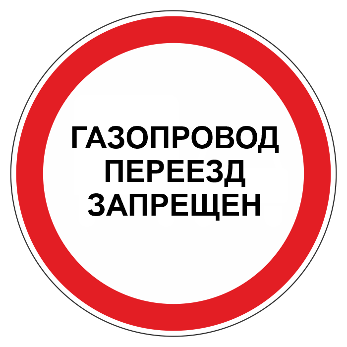 Знак «Газопровод. Переезд запрещен» необходимо устанавливать в местах неорганизованных переездов через газопроводы. Диаметр знака должен соответствовать дорожным знакам, 600 мм или 700 мм