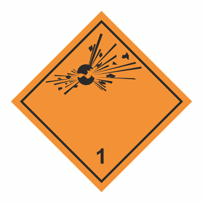 Знак перевозки опасных грузов «Класс 1. Взрывчатые вещества и изделия» должен крепиться на транспортные средства, перевозящие взрывчатые вещества и изделия — 2 комплекта по бокам и 1 сзади (согласно пп. 5.3.1.4.1 главы 5.3 ДОПОГ)