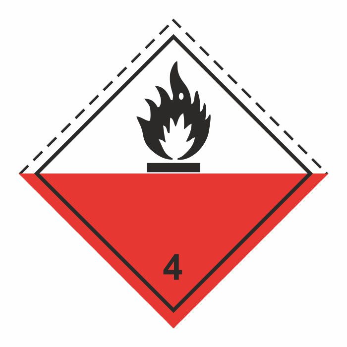 Знак перевозки опасных грузов «Класс 4.2. Вещества, способные к самовозгоранию» должен крепиться на транспортные средства, перевозящие вещества, способные к самовозгоранию — 2 комплекта по бокам и 1 сзади (согласно пп. 5.3.1.4.1 главы 5.3 ДОПОГ)