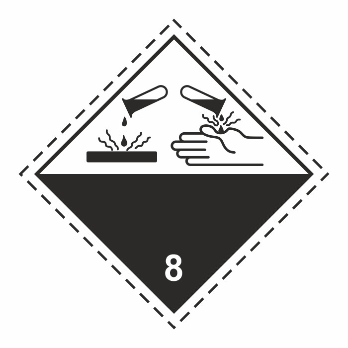 Знак перевозки опасных грузов «Класс 8. Коррозионные вещества» должен крепиться на транспортные средства, перевозящие коррозионные вещества — 2 комплекта по бокам и 1 сзади (согласно пп. 5.3.1.4.1 главы 5.3 ДОПОГ)
