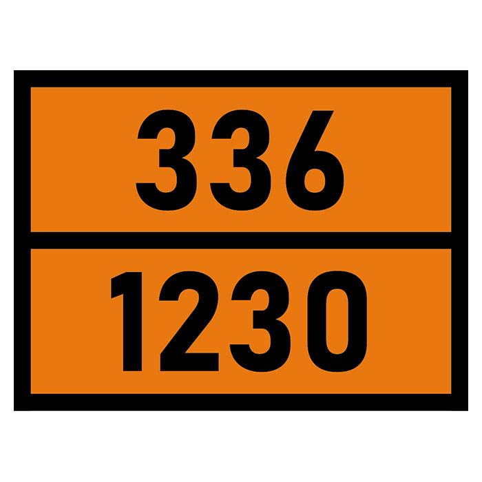 Табличка «Опасный груз 336-1230», Метанол – знак опасности оранжевого цвета с идентификационным номером, определенным ООН и указывающим на класс и вид вещества. Материал: пленка, размеры: 400х300 мм. Устанавливается на транспортное средство с целью информирования и обеспечения безопасности при перевозке опасных грузов. На автомобиле должно быть установлено две таблички: одна спереди, вторая сзади.