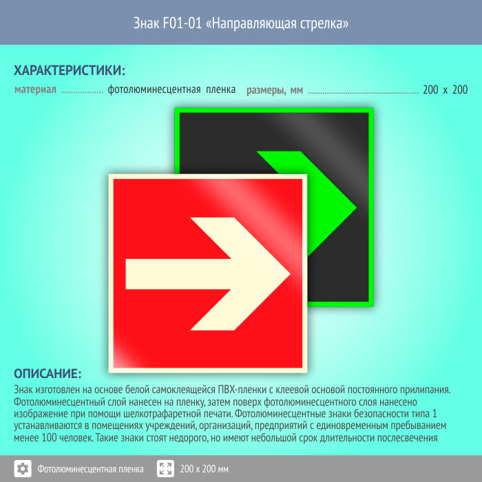 Знак F01-01 «Направляющая стрелка» на фотолюминесцентной пленке, размером 200х200 мм указывает направление пути эвакуации налево или направо. Знаки пожарной безопасности изготовлены согласно ГОСТ Р 12.4.026-2015 и предназначены для обозначения мест нахождения средств противопожарной защиты и средств оповещения о возникновении пожара