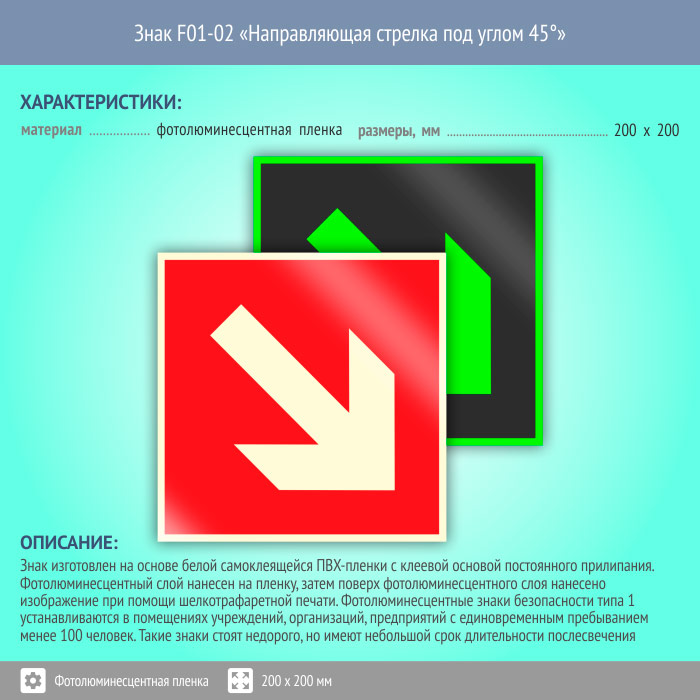 Знак F01-02 «Направляющая стрелка под углом 45°» на фотолюминесцентной пленке, размером 200х200 мм указывает направление пути эвакуации вверх или вниз. Знаки пожарной безопасности изготовлены согласно ГОСТ Р 12.4.026-2015 и предназначены для обозначения мест нахождения средств противопожарной защиты и средств оповещения о возникновении пожара