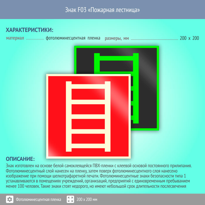 Знак F03 «Пожарная лестница» (фотолюминесцентная пленка, 200х200 мм)