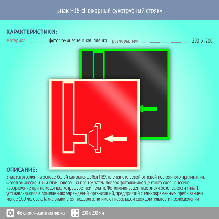 Знак F08 «Пожарный сухотрубный стояк» (фотолюминесцентная пленка, 200х200 мм)
