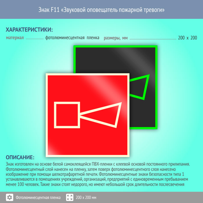 Знак F11 «Звуковой оповещатель пожарной тревоги» на фотолюминесцентной пленке, размером 200х200 мм обозначает место расположения оповещателя в случае пожара. Знаки пожарной безопасности изготовлены согласно ГОСТ Р 12.4.026-2015 и предназначены для обозначения мест нахождения средств противопожарной защиты и средств оповещения о возникновении пожара