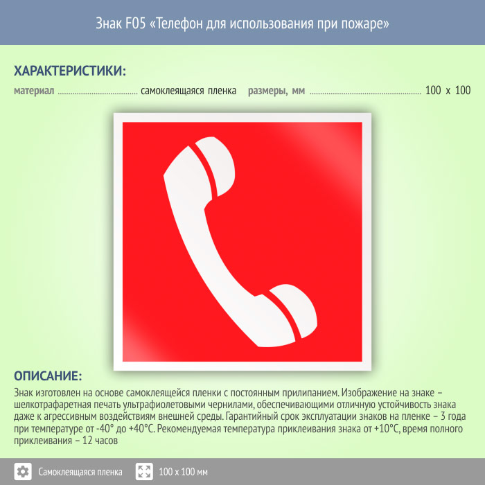 Знак F05 «Телефон для использования при пожаре (в том числе телефон прямой связи с пожарной охраной)» (пленка, 100х100 мм)