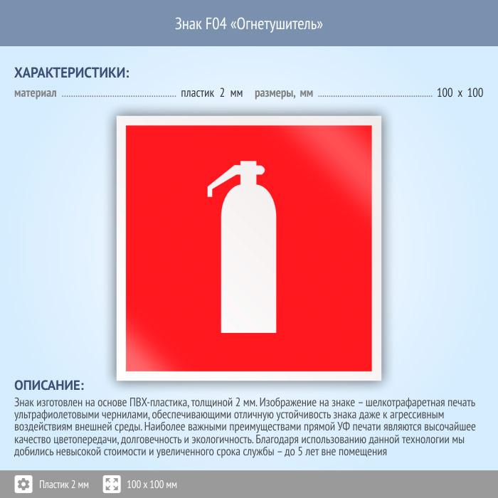 Знак F04 «Огнетушитель» на пластике, размером 100х100 мм обозначает место расположения одного или нескольких огнетушителей. Знаки пожарной безопасности изготовлены согласно ГОСТ Р 12.4.026-2015 и предназначены для обозначения мест нахождения средств противопожарной защиты и средств оповещения о возникновении пожара