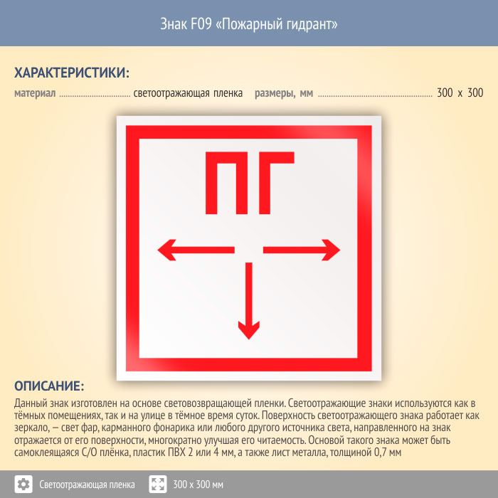 Знак F09 «Пожарный гидрант» на светоотражающей пленке, размером 300х300 мм указывает пожарному расчету расстояние до ближайшего подземного гидранта, тем самым позволяя сократить время подготовки к тушению, в целях минимизации потерь и скорейшего устранения возгорания. Знаки пожарной безопасности изготовлены согласно ГОСТ Р 12.4.026-2015 и предназначены для обозначения мест нахождения средств противопожарной защиты и средств оповещения о возникновении пожара