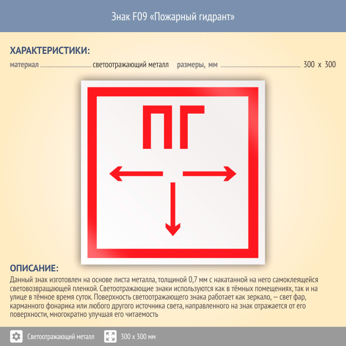Знак F09 «Пожарный гидрант» на светоотражающем металле, размером 300х300 мм указывает пожарному расчету расстояние до ближайшего подземного гидранта, тем самым позволяя сократить время подготовки к тушению, в целях минимизации потерь и скорейшего устранения возгорания. Знаки пожарной безопасности изготовлены согласно ГОСТ Р 12.4.026-2015 и предназначены для обозначения мест нахождения средств противопожарной защиты и средств оповещения о возникновении пожара