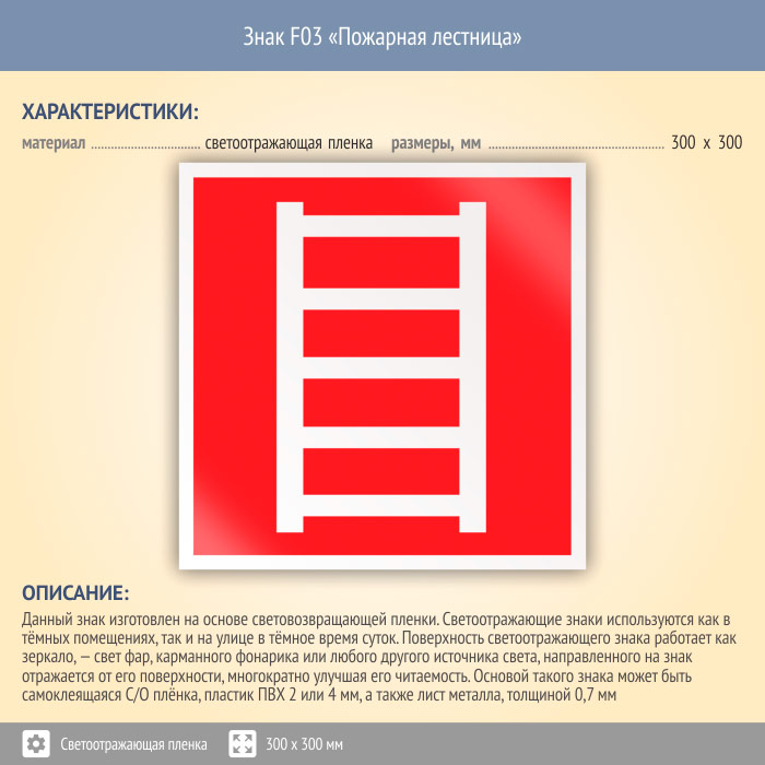Знак F03 «Пожарная лестница» (светоотражающая пленка, 300х300 мм)